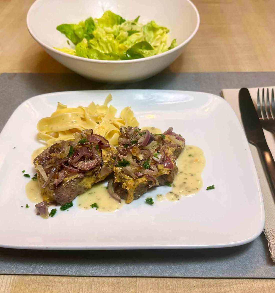 Den Backofen auf 220 Grad vorheizen. Zuerst werden die roten Zwiebeln geschält, geviertelt, geschnitten, in Öl glasig angedünstet, leicht mit Salz und Pfeffer gewürzt und zur Seite gestellt. In einer weiteren Pfanne das Öl erhitzen. Zu Beginn bei großer Hitze, dann auf mittlerer Stufe, je nach Dicke der Steaks 5–7 Minuten gebraten. Mit Salz und Pfeffer nach Geschmack würzen. 3 EL Dijonsenf und 3 EL Dijonsenf grobkörnig mit den Semmelbrösel in einer Schüssel vermischen, die Steaks von beiden Seiten dick einstreichen und in eine feuerfeste Form geben. Zwiebel darüber geben und ab damit in den Backofen für ca. 5–7 Minuten. Vor dem Servieren Petersilie darüber streuen. Wir essen dazu gerne Pasta mit einer leichten Estragon Sauce, doch auch Salzkartoffel oder Stampfkartoffeln passen zu diesem Gericht sehr gut. Guten Appetit!
