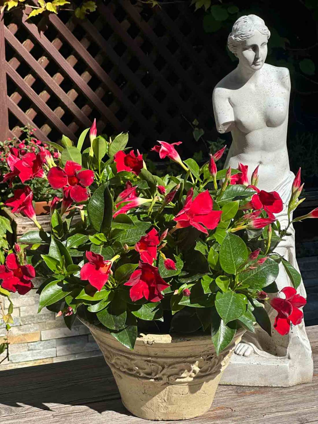Die üppigen Trichterblüten, die von Mai bis Oktober zu sehen sind, gibt es in den Farben Rot, Weiß, Rosa und als Neuzüchtung auch in Gelb. Da die Dipladenia sehr empfindlich auf Frost reagiert habe ich sie spät eingepflanzt. Auch nach den Eisheiligen hatten wir nachts Temperaturen zwischen 4 und 6 Grad was der Pflanze zu kalt ist und sie schnell absterben würde. Bilder vom Friedhof wird es keine geben, finde es unangebracht dort zu fotografieren, doch den bepflanzten Topf zu Hause in meinem Garten zeige ich euch gerne.