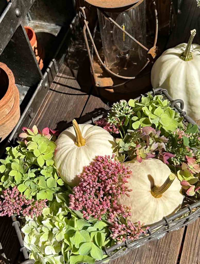 Frisch aus dem Garten! Die Hortensien sind nun verblüht und leuchten nun in den schönsten Herbstfarben. Die Fette Henne hingegen blüht im Beet noch wunderschön, hat im Oktober ihren großen Auftritt und sorgt für einen roten Farbtupfer. Ich wollte nicht schon wieder einen Kranz binden und habe mich für ein einfaches Gesteck entschieden. Alles, was ihr dafür braucht, sind zwei getrocknete Hortensienblüten und ein paar Zweige der Fetten Henne. Als Gefäß eignet sich alles – eine Schale, ein Körbchen oder ein tiefer Teller. Zuerst werden die Blumen auf die passende Länge geschnitten und ein Steckschwamm in das Gefäß gestellt. Abwechselnd werden jetzt die Blumen eingesteckt und dann kann das Gefäß mit Kürbissen, Äpfel und Birnen oder mit Granatäpfeln dekoriert werden.