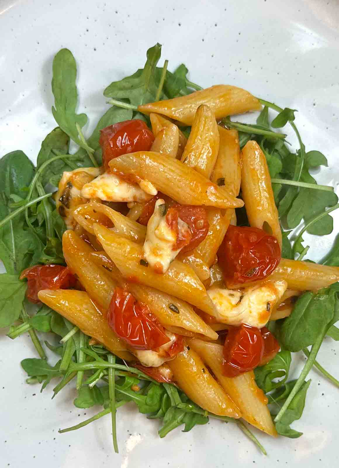 Penne nach Packungsanweisung kochen. Zwiebel und Knoblauch abziehen und fein würfeln. Kirschtomaten waschen und halbieren. In einer Pfanne mit Olivenöl Zwiebel und Knoblauch glasig andünsten. Tomatenmark dazu und kurz anrösten. Tomaten und Chilischote dazu geben, mit Salz und Pfeffer aus der Mühle nach Geschmack würzen und für ca. 5 Minuten köcheln lassen. Hierbei nach und nach Olivenöl eintröpfeln lassen. Die Menge Olivenöl mache ich nach Gefühl, jedoch sollten die Penne nicht im Olivenöl schwimmen. Der in Stücke geschnittene Mozzarella kommt kurz vor dem Servieren in die Pfanne. Penne abgießen mit den Tomaten vermischen und Basilikum dazu. Auf die Teller Rucola und Penne verteilen und sofort servieren. Guten Appetit!
