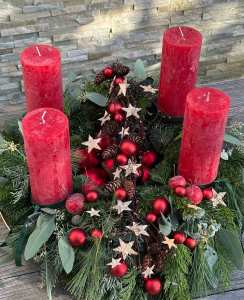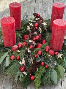 Um die „staade Zeit“ einzuleuchten muss als allererstes der Adventskranz stehen, begleitet er uns doch durch die gesamte Adventszeit. Ein wenig ungewöhnlich – bei Sonnenschein und Temperaturen um die 18 Grad habe ich dieses Jahr meinen Kranz auf der Terrasse gebunden, dieses Jahr wieder klassisch aus grüner Tanne, Eukalyptus und Koniferen mit roten Kerzen. In der Mitte des Kranzes liegt ein Bündel Zweige, die ich mit Zapfen, roten Kugeln und Holzsternen beklebt habe. Der 1. Advent kann kommen! Nach den ungewöhnlich warmen Tagen hatten wir einen Temperatursturz und seit Donnerstag sogar Neuschnee und klirrende Kälte.
