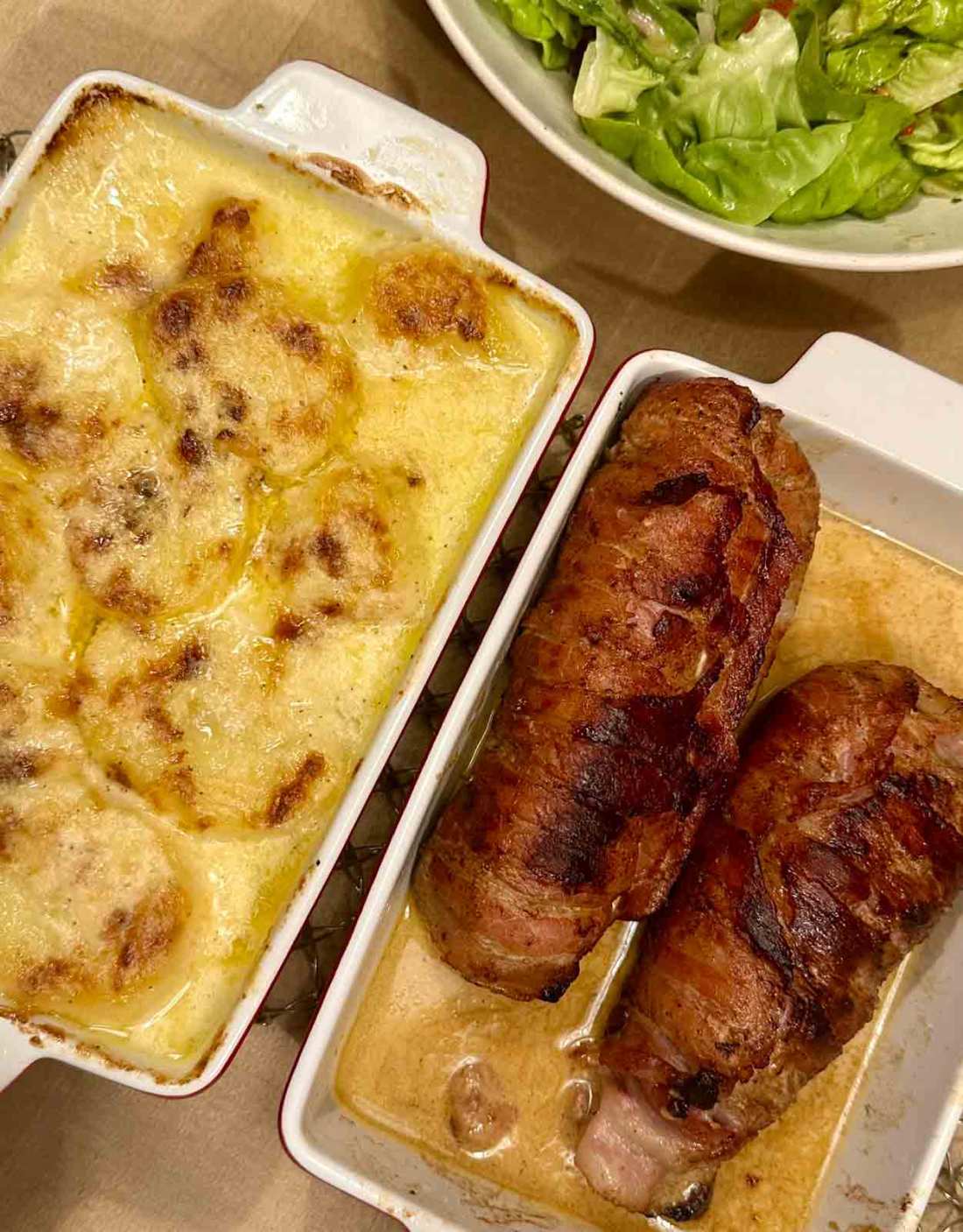 Kartoffelgratin und Schweinefilet im Speckmantel gab es bei uns am letzten Sonntag – ein wahres Sonntagsessen. Das Schweinefilet wird portioniert, mit Salz, Pfeffer, Thymian und Senf gewürzt. Mit dünnem Frühstücksspeck ummantelt und in einer großen Pfanne scharf angebraten, bis der Speck kross ist. Anschließend wird das Schweinefilet in einer Auflaufform im Backofen für ca. 25 bis 30 Minuten zusammen mit dem Kartoffelgratin gegart.