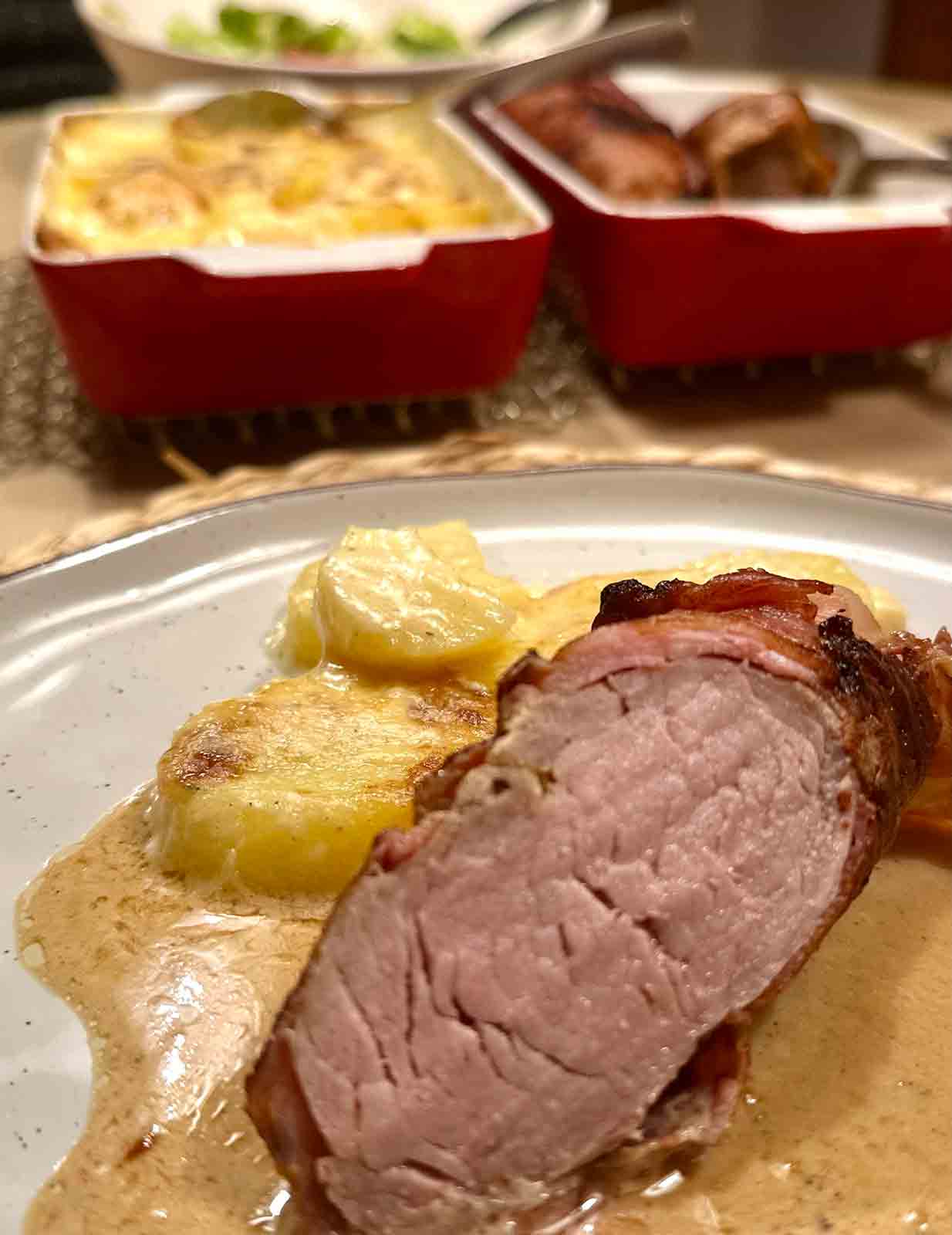 Kartoffelgratin mit Schweinefilet im Speckmantel