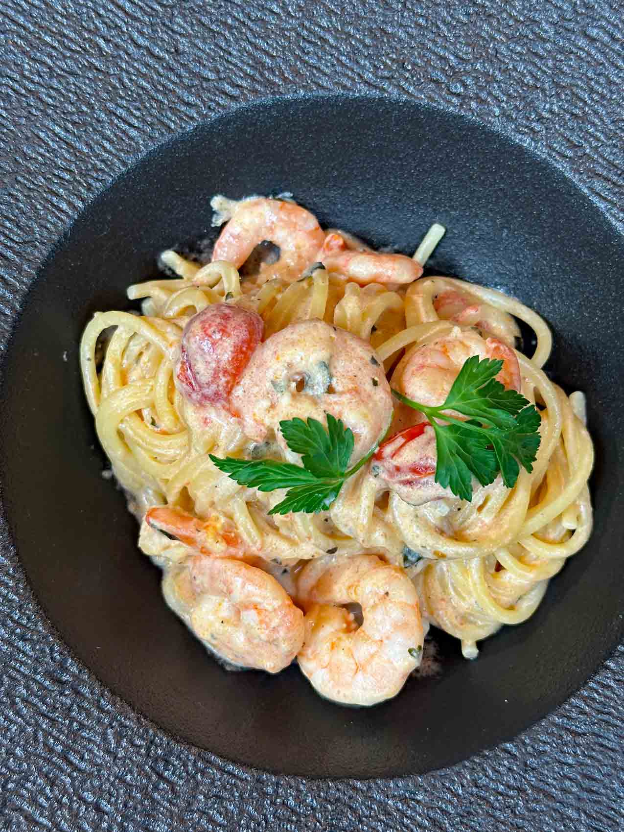 Spagetti mit Garnelen in einer cremigen Frischkäsesauce