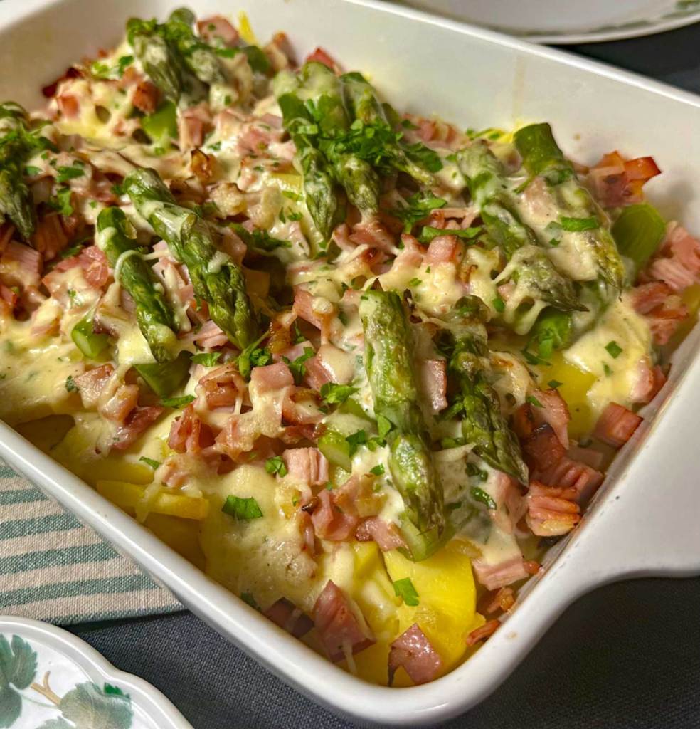 Kartoffel waschen, mit der Schale kochen, nach der Garzeit die Pelle abziehen und in Scheiben schneiden. Den grünen Spargel waschen, die Enden abschneiden und in einem Topf mit etwas Zitronensaft, Salz und einem TL Butter bissfest garen. Schalotten in Würfel schneiden, in Butter glasig anbraten und den in Würfel geschnittenen gekochten Schinken dazugeben. Mit Weißwein ablöschen. Sahne, Frischkäse und etwas Spargelsud, mit Salz und Pfeffer abschmecken und zum Schluss die gehackte Petersilie dazu. Die Kartoffelscheiben in eine Auflaufform schichten, mit Sauce bedecken und den Spargel hinzu. Geriebenen Bergkäse darüber streuen und im vorgeheizten Backofen für ca. 20 bis 25 Minuten backen. Guten Appetit!